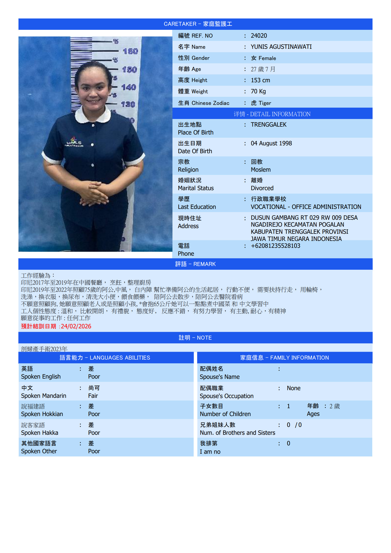 | 經歷 2 | 印尼2019年至2022年照顧75歲的阿公,中風, 白內障 幫忙準備阿公的生活起居, 行動不便, 需要扶持行走, 用輪椅, 洗澡,換衣服,換尿布,清洗大小便,餵食餵藥, 陪阿公去散步,陪阿公去醫院看病不願意照顧狗, 她願意照顧老人或是照顧小孩, *會抱65公斤她可以一點點煮中國菜 和 中文學習中 |