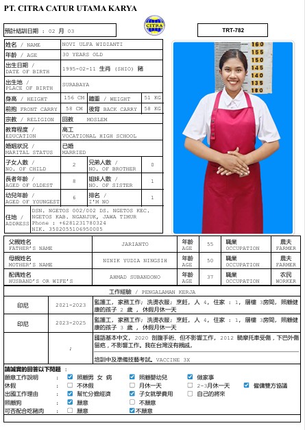 經歷1 印尼 2021-2023監護工, 家務工作; 洗燙衣服; 烹飪, 人 4, 住家 : 1, 層樓 3房間, 照顧健