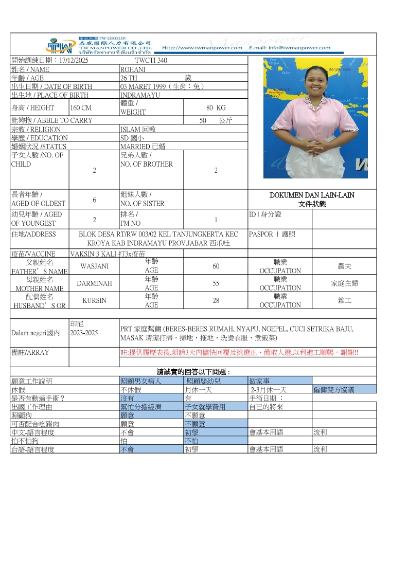 ROHANI 詳細履歷 影片查看 編號 TWCTI 340 姓名 ROHANI 年齡 26歲 身高 160CM 體重 80KG 語言 國語基本中文 宗教 回教 備註 國語基本中文, 我在台灣沒有親戚 經歷 1 印尼2023-2025年家庭幫傭 清潔打掃,掃地,拖地,洗燙衣服,煮飯菜 預計結訓日期 114年 2 月 17 日 You Might Also Like WAHYUNINGSIH 2025 年 7 月 18 日 ALYA TIARA PUTRI 2025 年 6 月 12 日 IRA YUNITASARI 2025 年 7 月 18 日