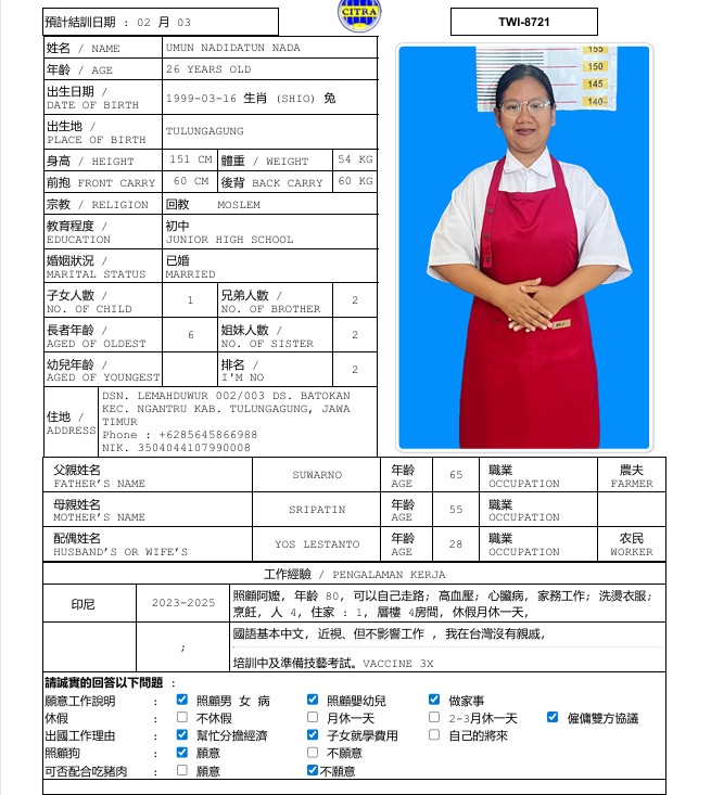 UMUN NADIDATUN NADA 詳細履歷 影片查看 編號 TWI-8721 姓名 UMUN NADIDATUN NADA 年齡 26歲 身高 151CM 體重 54KG 語言 國語基本溝通 宗教 回教 備註 國語基本中文, 近視、但不影響工作 , 我在台灣沒有親戚, 經歷 印尼 2023-2025照顧阿嬤, 年齡 80, 可以自己走路; 高血壓; 心臟病, 家務工作; 洗燙衣服; 烹飪, 人 4, 住家 : 1, 層樓 4房間, 休假月休一天 經歷 2 預計結訓日期 115年 02 月 03日 You Might Also Like HERA HUMAEROH 2025 年 6 月 4 日 KHUSNIA AGUSTIN FITTRIANI 2025 年 6 月 3 日 NURYATI 2026 年 2 月 10 日